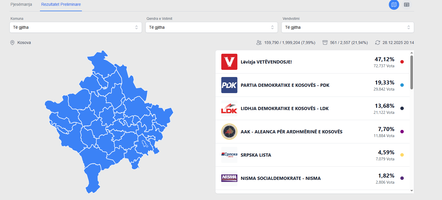 Komisioni Qendror i Zgjedhjeve po i përditëson në vazhdimësi rezultatet e dala nga numërimi i votave në vendvotime. Deri në përditësimin e fundit të bërë në ora 20:18, janë numëruar 21,84% i votave. Ky është rezultati: VV: 47,12% PDK: 19,33% LDK: 13,68% AAK: 7,% Lista Serbe: 4,59 Nisma: 1,82