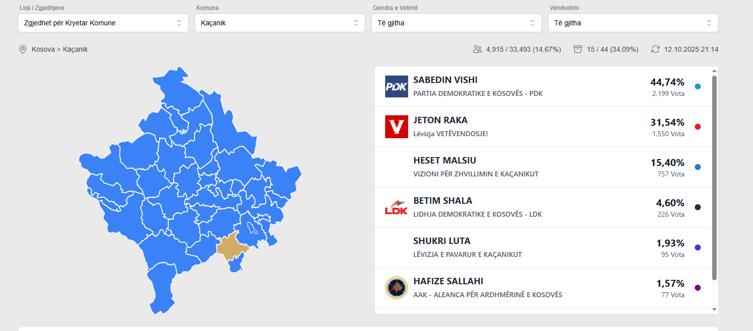 Komisioni Qendror i Zgjedhjeve ka publikuar rezultatet e numërimit të 34.09% të vendvotimeve. Bazuar në këto rezultate në këtë komunë do të ketë balotazh. Në këtë balotazh shkon PDK dhe VV. Rezultatet: PDK – Sabedin Vishi: 44.74% VV – Jeton Raka: 31.54% Vizioni për zhvillimin e Kaçanikut – Heset Malsiu: 15.4% LDK – Betim Shala:…