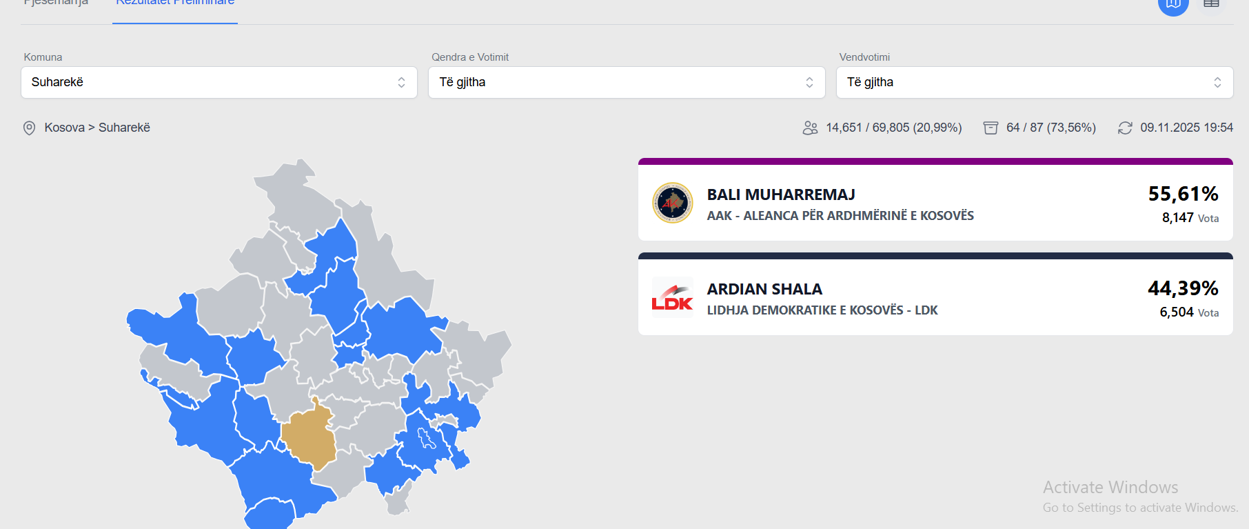 Komisioni Qendror veçse ka filluar publikimin e rezultateve të para nga zgjedhjet e sotme. Në kuadër të përqindjes së deritanishme del se nga numërimi i 73.56% të votave, Bali Muharremaj nga radhët e AAK-së mori 55.61%, transmeton lajmi.net. Kurse kandidati i LDK-së, Ardian Shala del se mori 44.39%./Lajmi.net/