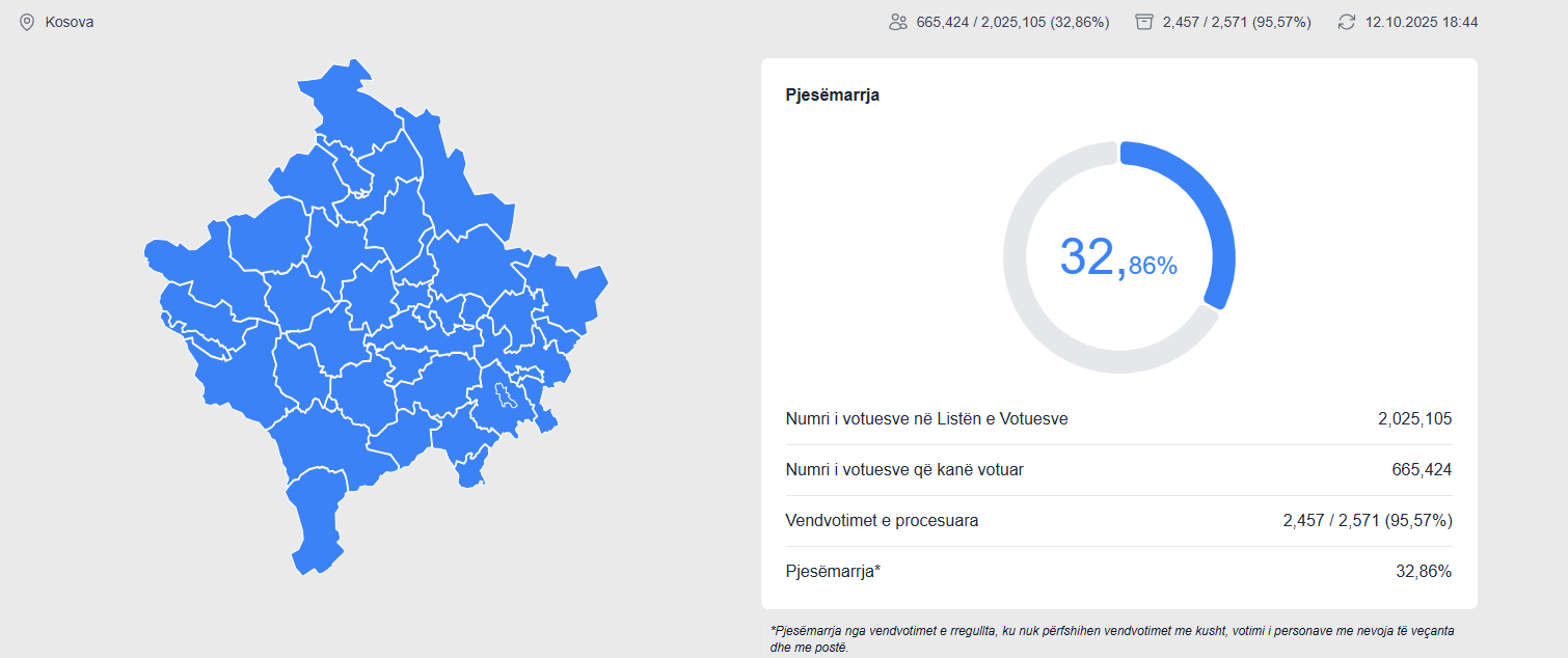 Bazuar në rezultatet e përditësuara të KQZ-së në orën 18:44, 32.86% kanë dal për të votuar.