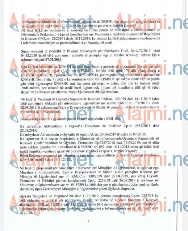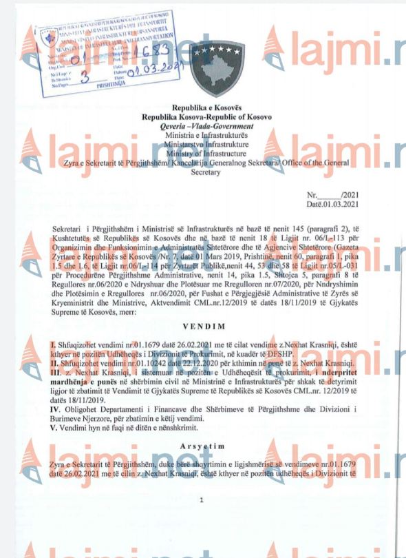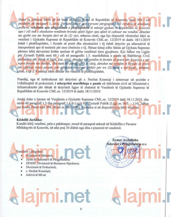 “z.Nexhat Krasniqi i sistemuar në pozitën e Udhëheqësit të Prokurimit i ndërpritet marrëdhënia e punës në shërbimin civil në Ministrinë e Infrastrukturës për shkak të detyrimit ligjor të zbatimit të Vendimit të Gjykatës Supreme të Republikës së Kosovës CML.nr.12/2019 të datës 18.11.2019”, thuhet mes tjerash në vendim. /Lajmi.net/