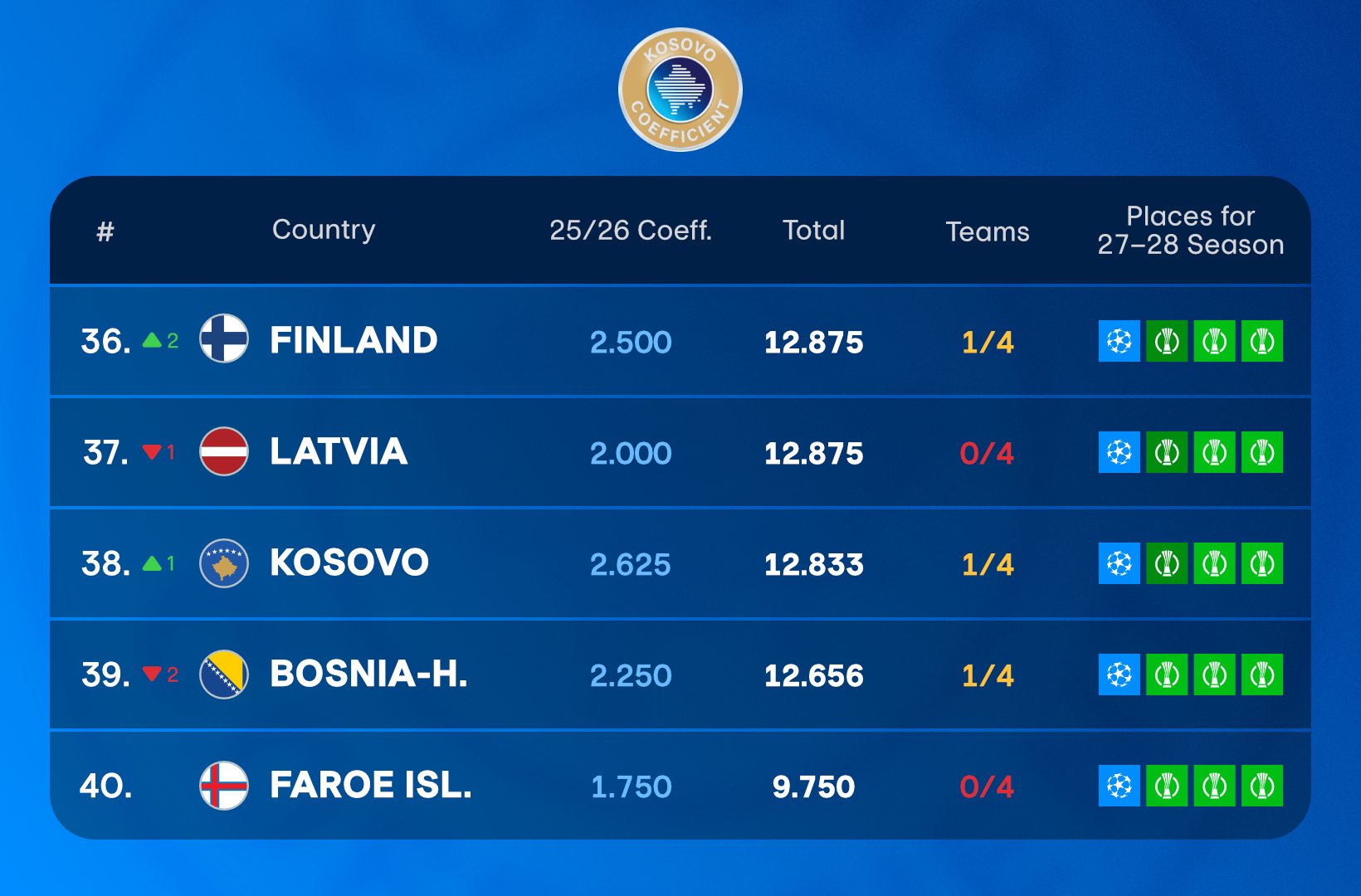 Kujtojmë që Kosova përfaqësohet me vetëm një klub në garat e UEFA-s, pra ajo e Dritës e cila në dy ndeshje ka arritur t’i grumbullojë dy pikë.