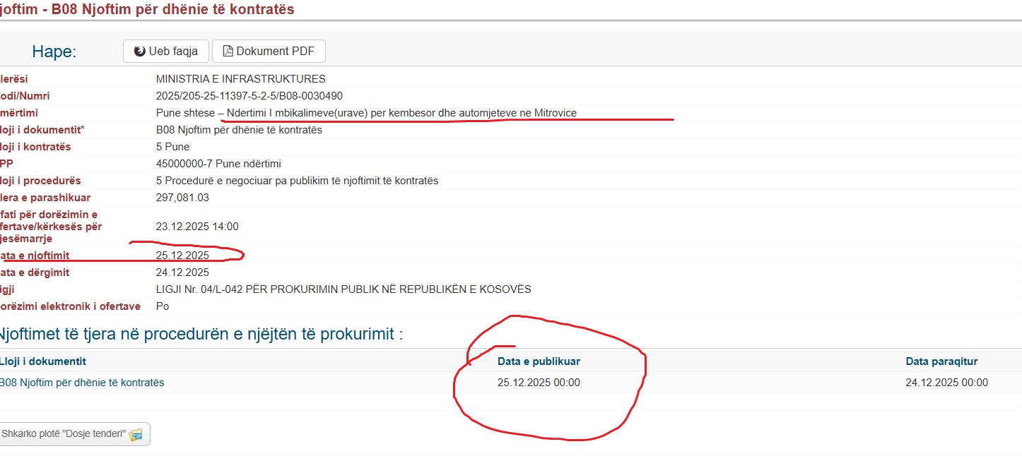 Vetëm disa ditë pasi Qeveria e Kosovës organizoi përurimin e dy urave në Mitrovicë, dokumentet zyrtare tregojnë se projekti nuk ka qenë i përfunduar në tërësinë e tij. Në kundërshtim me mesazhin publik të dhënë gjatë ceremonisë, Ministria e Infrastrukturës ka publikuar tashmë një njoftim të ri për dhënie kontrate, që lidhet drejtpërdrejt me të njëjtin projekt.