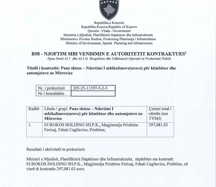 Sipas njoftimit të publikuar sot (në ditë pushimi) nga Ministria e Infrastrukturës, bëhet fjalë për punë shtesë në projektin “Ndërtimi i mbikalimeve (urave) për këmbësorë dhe automjete në Mitrovicë”. Kontrata është dhënë për operatorin të njëjtë ekonomik EUROKOS HOLDING SH.P.K., me një vlerë prej 297,081.03 euro.