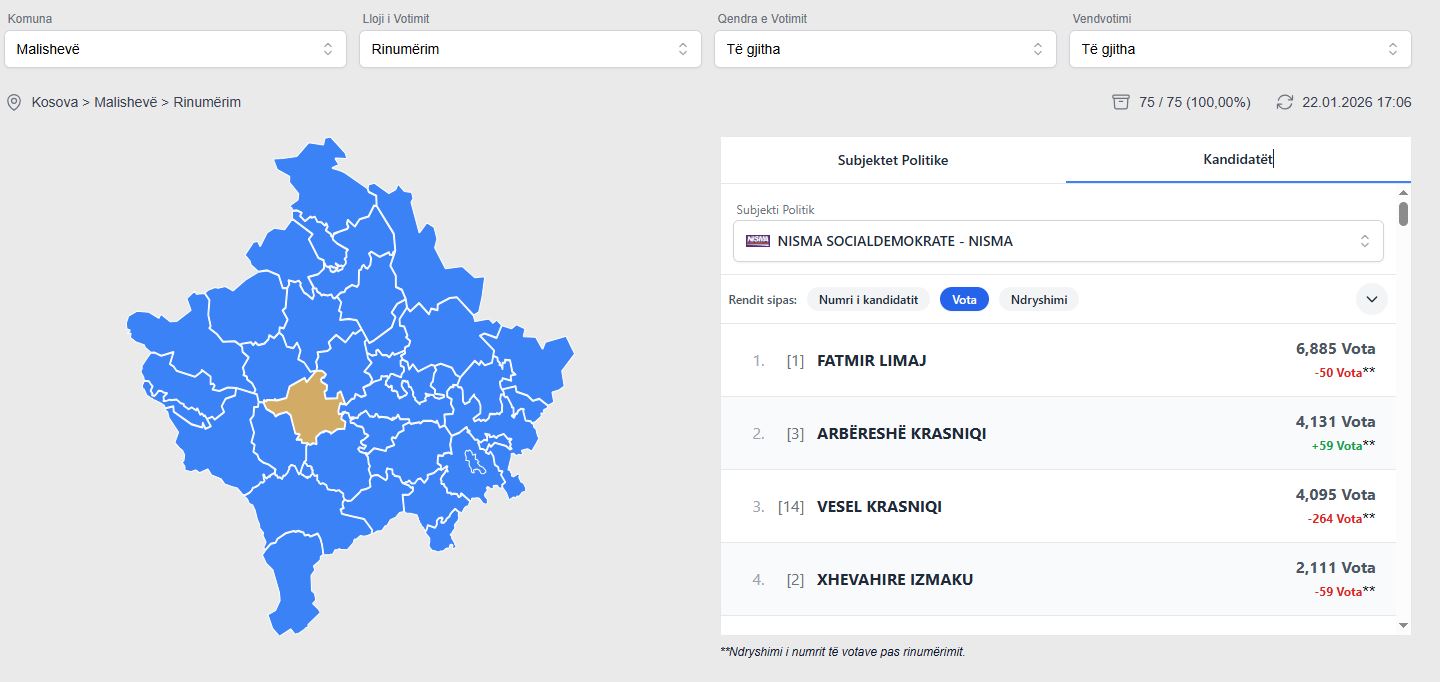 Kurse, Limaj si kandidat, pas rinumërimit, del që i ka 6885 vota në Malishevë./lajmi.net/