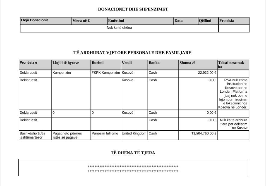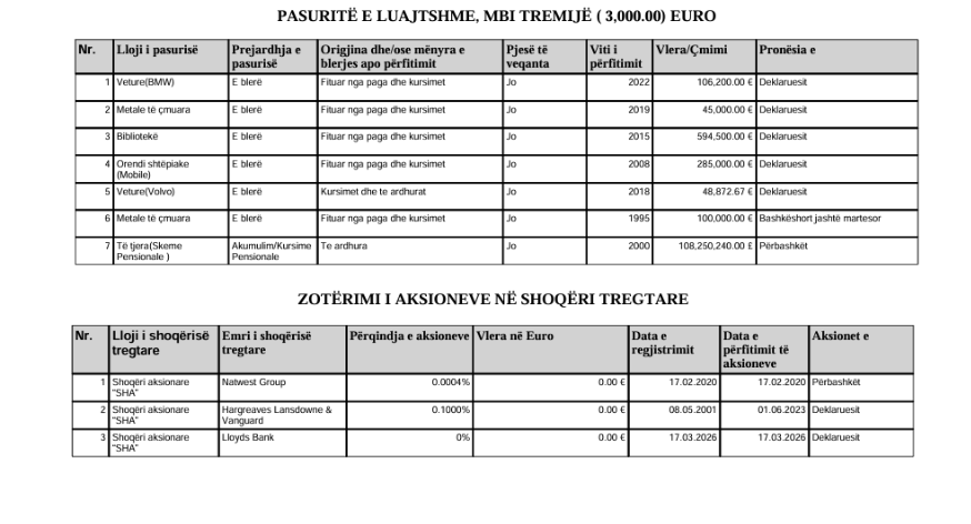 Si pagë vjetore, Bajra ka deklaruar 22 mijë e 932 euro nga Trusti pensional ndërsa bashkëshortja jashtëmartesore ka deklaruar 13 milionë e 504 mijë e 760 paund pagë vjetore. /Lajmi.net/