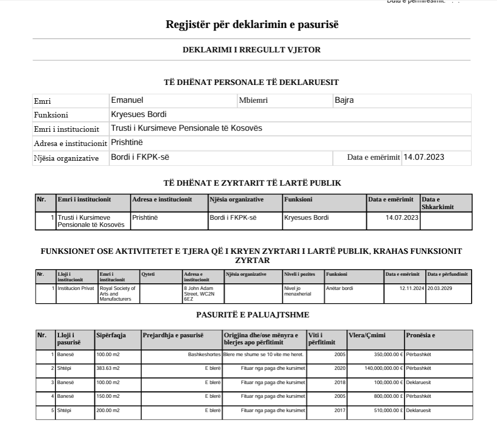 Emanuel Bajra, kryesuesi i Bordit të Trustit të Kursimeve Pensionale të Kosovës është një nga më të pasurit në vend.