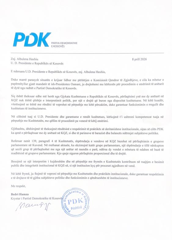Në letrën e dërguar, PDK thekson se përbërja e KQZ-së ka mbetur e papërfunduar gjatë mandatit të ish-Presidentes Vjosa Osmani dhe se përfaqësimi i partisë me dy anëtarë në këtë institucion nuk është një çështje interpretimi politik, por një e drejtë që rrjedh nga dispozitat kushtetuese.