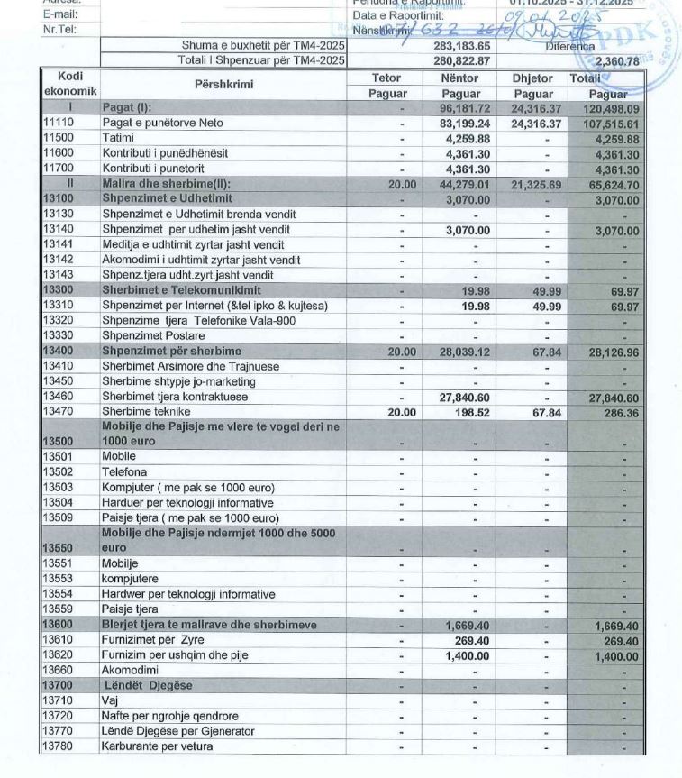 PDK shpenzoi 2,360 euro më pak sesa buxheti që pati për tre muajt e fundit të 2025-ës