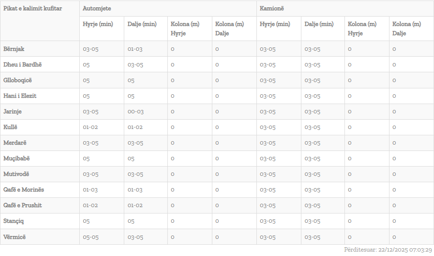 Janë përditësuar të dhënat nga Qendra Kombëtare për Menaxhim Kufitar lidhur me kolonat në pikat kufitare në Kosovë. Sipas të dhënave të fundit, pritjet për hyrje dhe dalje nga Kosova janë të shkurta, transmeton KosovaPress. Raportohen pritje deri në 5 minuta në hyrje në Muçibabë, Bërnjak, Dheu i Bardhë, Glloboqicë, Stançiq, Mutivodë dhe Vërmicë.