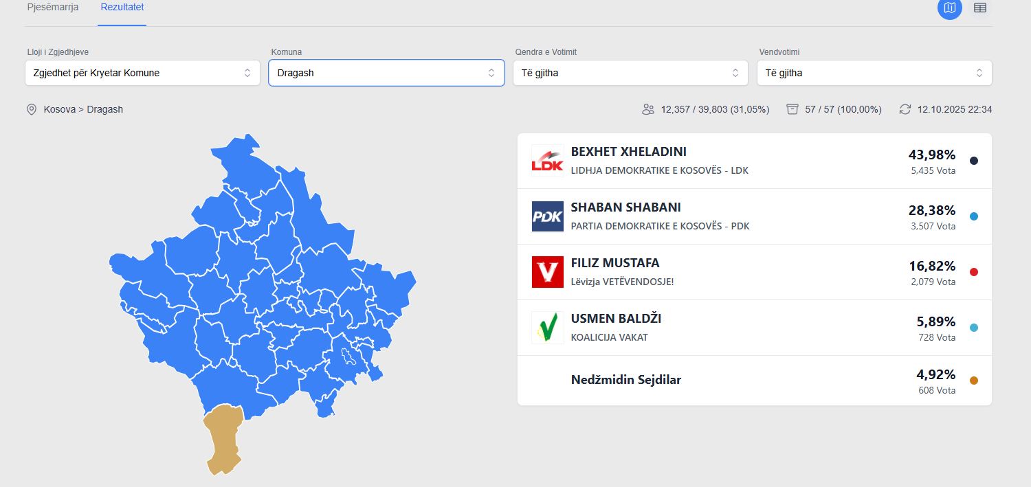 Ka përfunduar numërimi i 100% të votave në Komunën e Dragashit. Bazuar në rezultatet e publikuara kjo komunë do të shkojë rrejt balotazhit të 9 nëntorit. Bexhet Xheladini nga LDK-ja doli me 43.98%, kurse Shaban Shabani nga PDK-ja me 23.38%./Lajmi.net/