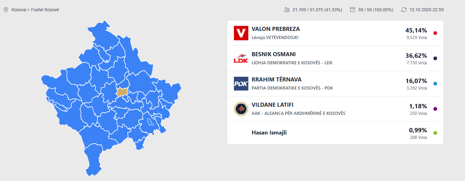 Komisioni Qendror i Zgjedhjeve ka përfunduar numërimin e votave në qytetin e Fushë Kosovës. Bazuar në këto rezultate, kjo komunë do të shkoj në balotazh. Rezultatet: VV – Valon Prebrezqa: 45.14% LDK – Besnik Osmani: 36.625 PDK – Rrahim Tërnava: 16.07% AAK – Vildane Latifi: 1.18% Hasan Ismajli: 0.99%
