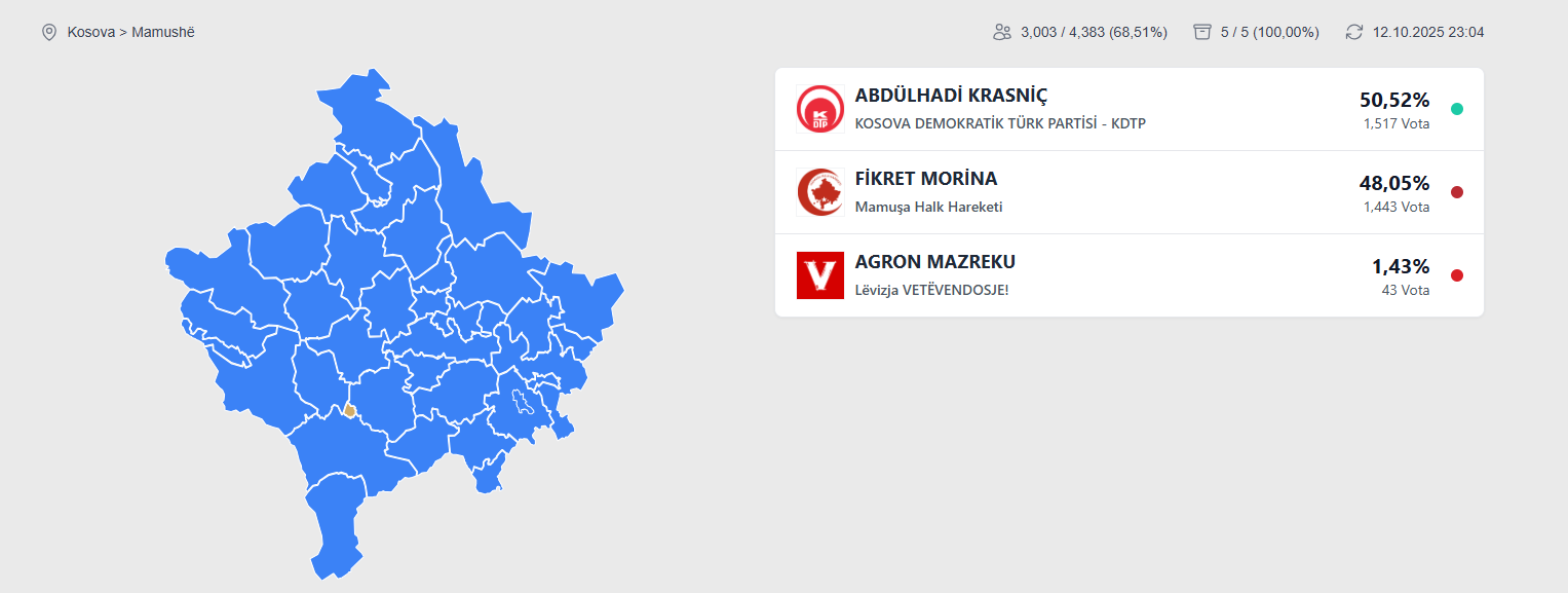 Komisioni Qendror i Zgjedhjeve ka publikuar 100% e rezultateve në Mamushë.