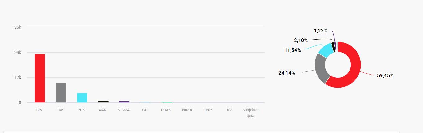 Sipas rezultateve të publikuara nga KQZ, Lëvizja Vetëvendosje është radhitur e para më 59.45% e pasuar nga Lidhja Demokratike e Kosovës e dyta më 24.14%.