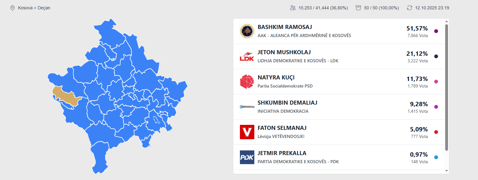Komisioni Qendror i Zgjedhjeve ka publikuar rezultatet e votimit në të gjitha qendrat e votimit në Deçan. Bazuar në këto rezultate, Bashkim Ramosaj fiton përsëri pa balotazh. Rezultatet: AAK – Bashkim Ramosaj: 51.57% LDK – Jeton Mushkolaj: 21.12% PSD – Natyra Kuçi: 11.73% Iniciativa Demokracia – Shkumbun Demaliaj: 9.28% VV – Faton Selmanaj: 5.09% PDK…