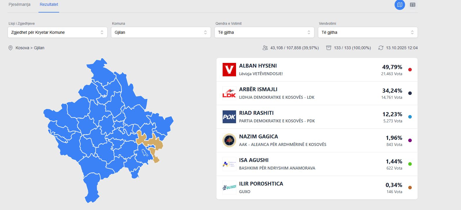 Nga rezultatet e nxjerra nga 100% e votave tanimë të numëruara del se Alban Hyseni i VV-së dhe Arbër Ismajli i LDK-së do të shkojnë në balotazh.
