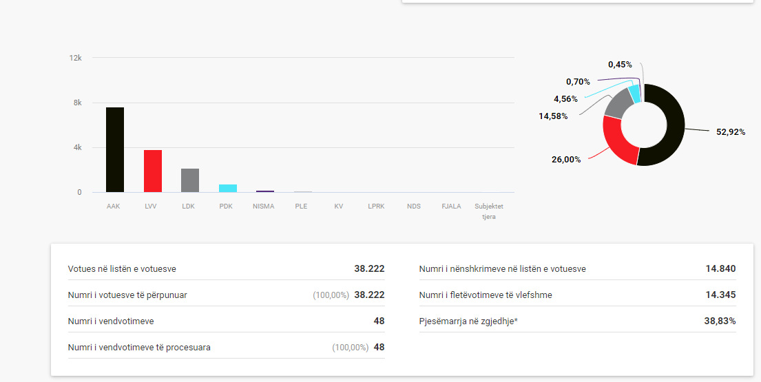 Sipas rezultateve nga KQZ, AAK-ja është radhitur e para me 52.92% e pasura nga Lëvizja Vetëvendosje 26.00%.