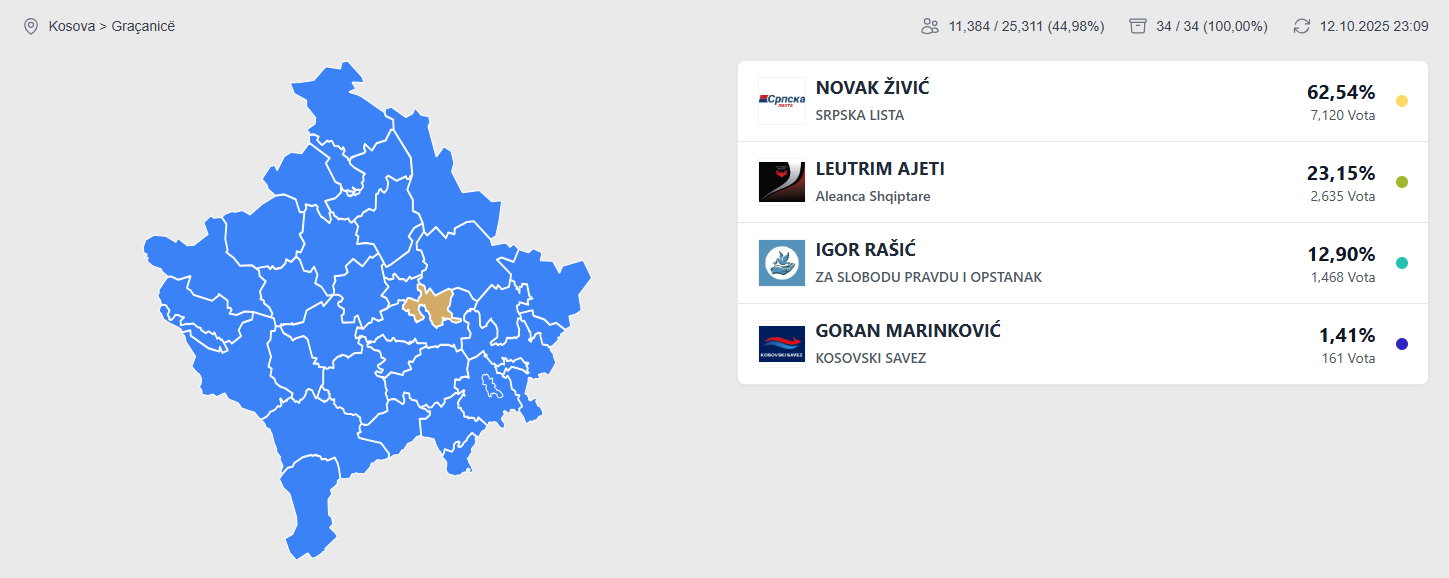 Komisioni Qendror i Zgjedhjeve ka publikuar 100% të rezultateve të votimit në Graçanicë. Bazuar në këto të dhëna, ka fituar kandidati i Listës Serbe, Novak Ziviç. Rezultatet: Lista Serbe – Novak Ziviç: 62.54% Aleanca Shqiptare – Leutrim Ajeti: 23.15% Za Slobodu Pravdu i Opstanak – Igor Rasiç: 12.9% Kosovski Savez – Goran Marinkoviç: 1.41%