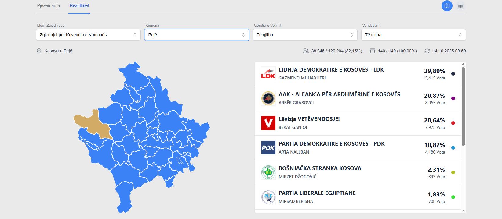 Ka përfunduar numërimi i votave për Kuvendin Komunal të Pejës nga zgjedhjet e së dielës. Në bazë të këtyre rezultateve LDK-ja prin me 39.89% të votave, kurse e dyta renditet AAK- me 20.87%. E treta në këtë komunë është Vetëvendosje me 20.64% dhe pas saj PDK me 10.82%./Lajmi.net/