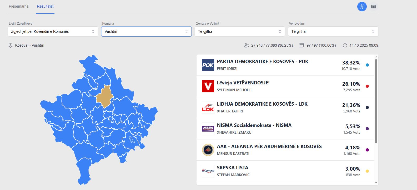 Edhe në Komunën e Vushtrrisë ka përfunduar numërimi i votave për Kuvendin Komunal. Bazuar në rezultatet tanimë finale del se PDK-ja mori 38.32% të votave për asamble, kurse Vetëvendosje 26.10%. Po ashtu LDK-ja mori 21.36% dhe Nisma 5.53% të votave./Lajmi.net/