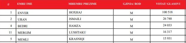 Në pesëshen me të votuar të PDK-së janë Enver Hoxhaj me 100 mijë e 518, i dyti është Uran Ismaili me 26 mijë e 748, Bedri Hamza me 24 mijë 033, Mergim Lushtaku 16 mije 317 dhe Memli Krasniqi me 15 mijë e 931 vota.