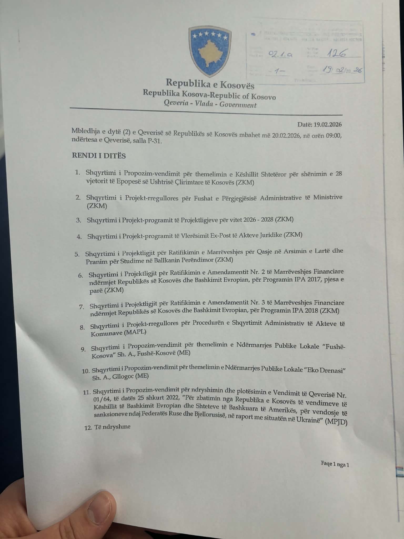Si pikë e parë është shqyrtimi i propozim-vendimit për themelimin e Këshillit Shtetërorë për shënimin e 28 vjetorit të Epopesë së UÇK-së.