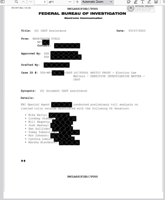 Dokumenti, në të cilin janë fshirë emrat e agjentëve të përfshirë, ka të shënuar numrin e rastit si “ARCTIC FROST—Election Law Matters—SENSITIVE INVESTIGATIVE MATTER—CAST.”