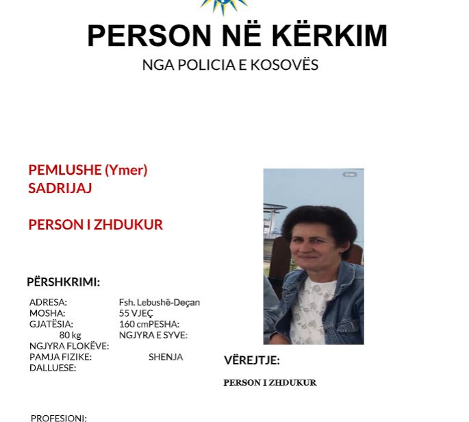 Policia e Kosovës po kërkon ndihmën e qytetarëve për gjetjen e Pemlushe (Ymer) Sadrijaj Policia kërkon që kushdo që ka informacion për vendndodhjen e këtij personi të zhdukur të lajmërojë Policinë e Kosovës apo të lajmërohet në stacionin më të afërt policor. Por edhe në numrat e telefonit dhe adresat elektronike të PK-së: 192 dhe…