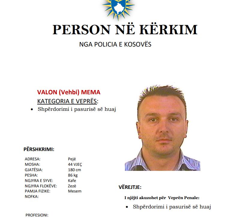 Policia e Kosovës - Drejtoria Rajonale e Policisë në Pejë, bazuar në ligj për publikimin e fotos me shënime tjera të personit të kërkuar më Urdhëresë të Gjykatës Themelore nё Pejë, me qëllim lokalizimin dhe rrjedhimisht arrestimin e tij, lëshon: Kërkesë për bashkëpunim me qytetarët.