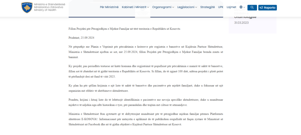 Projekti për përzgjedhjen e Mjekut Familjar në të gjithë territorin e Republikës së Kosovës, i paralajmëruar se do të përfundonte brenda vitit 2025, vazhdon të mbetet i parealizuar, duke ngjallur shqetësim te qytetarët dhe profesionistët e shëndetësisë.