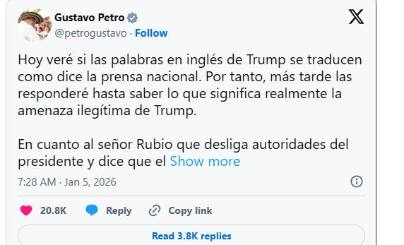 Petro e bëri këtë deklarim në rrjetet sociale, duke reaguar ndaj Trump i cili tha se një operacion ushtarak në Kolumbi i dukej “i mirë” pas kapjes së suksesshme të presidentit Venezuelan, Nicolas Maduro të shtunën.
