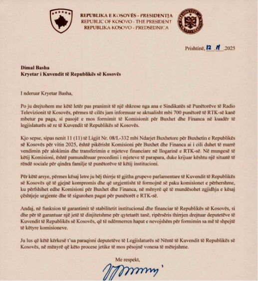 Presidentja e Kosovës, Vjosa Osmani, ka dërguar një letër kryetarit të Kuvendit, Dimal Bashës, duke kërkuar që të adresohet mungesa e komisionit për financa, i cili ka përgjegjësinë për aprovimin e mjeteve buxhetore për Radio Televizionin e Kosovës (RTK).