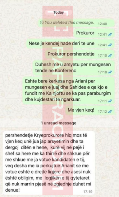 Mesazhin e prokurorit, i cili nuk është identifikuar, e ka siguruar Paparaci. Komunikimi është zhvilluar në Whatsapp.