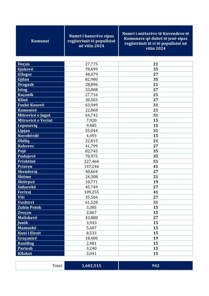 Sipas këtyre të dhënave, numri total i anëtarëve të kuvendeve komunale në të gjithë Kosovën do të jetë 942, të shpërndarë në bazë të madhësisë së popullsisë së secilës komunë.