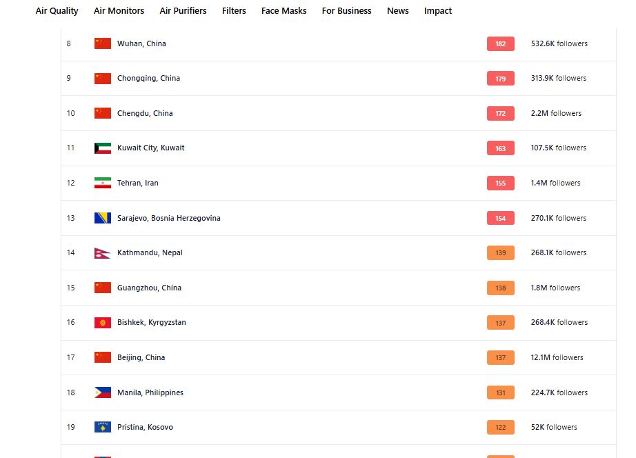 Prishtina po renditet e 19-ta në botë, sa i përket ndotjes së ajrit. Bazuar në matjet e “IQ Air”, vlera e nivelit të grimcave të dëmshme PM është 122. Bazuar në këto matje, këto vlera konsiderohen të dëmshme për njerëzit.