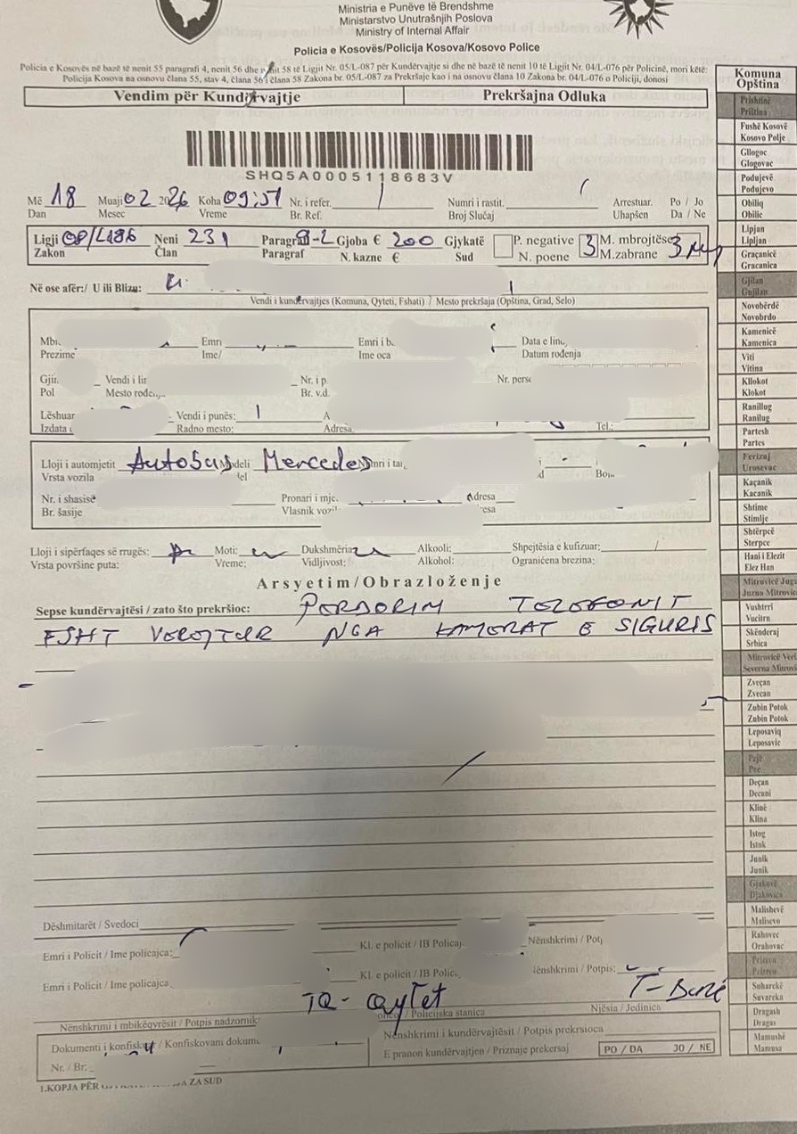 Njësiti i Trafikut të Kryeqytetit, në kuadër të monitorimit të vazhdueshëm përmes sistemit të kamerave në Prishtina, ka njoftuar se ka evidentuar një shofer autobusi duke përdorur telefonin gjatë vozitjes, për çka i është shqiptuar gjobë për kundërvajtje. Pas verifikimeve të mëtejshme, Policia thotë se është konstatuar se shoferi e ka përsëritur kundërvajtjen për herë…