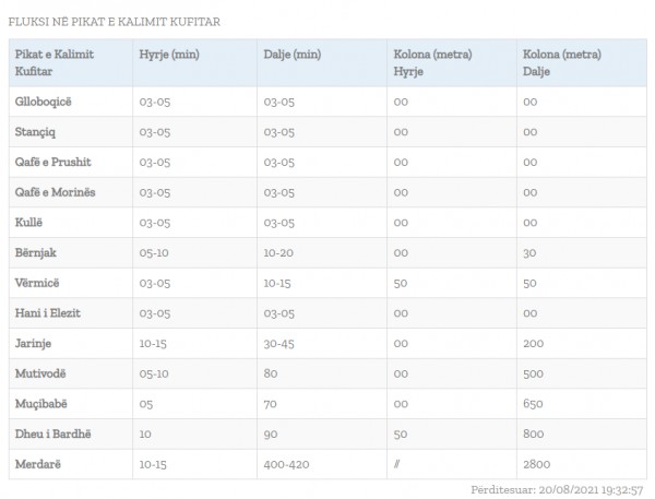 Sipas raportit të Qendrës Kombëtare për Menaxhimin Kufitar (përditësimi i orës 19:30), pritjet më të gjata regjistrohen në pikë-kalimin kufitar në Merdar, ku bashkatdhetarët po presin deri në 7 orë për ta kaluar kufirin me Serbinë, kurse kolona e automjeteve arrin deri në 2,8 km.