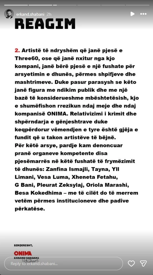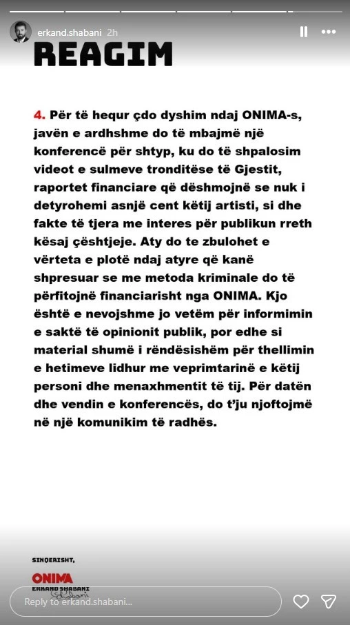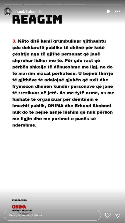 Erkand Shabani nga kompania ONIMA ka reaguar publikisht përmes disa postimeve në rrjetet sociale lidhur me rastin që përfshin artistin Besart Kelmendi – Gjesti.