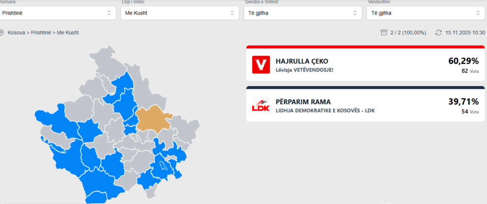 Sipas këtyre rezultateve, kandidati i LDK-së, Përparim Rama, pas numërimit të plotë të votave të personave me nevoja të veçanta, ka siguruar 108 vota, ndërsa kandidati i LVV-së, Hajrulla Çeku, ka marrë 68 vota, raporton lajmi.net