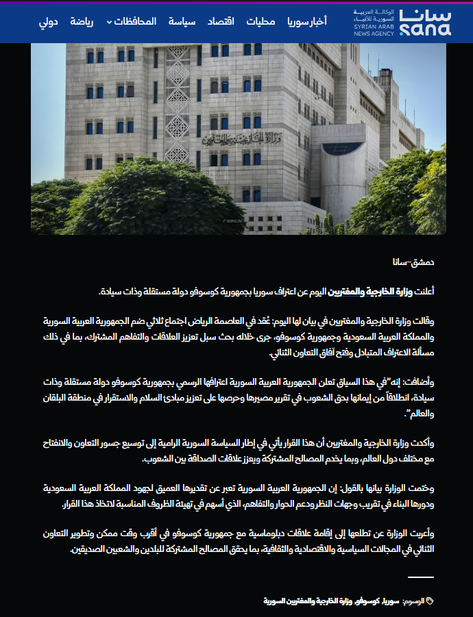 Ministria e Punëve të Jashtme të Sirisë ka njoftuar sot për njohjen e Republikës së Kosovës.