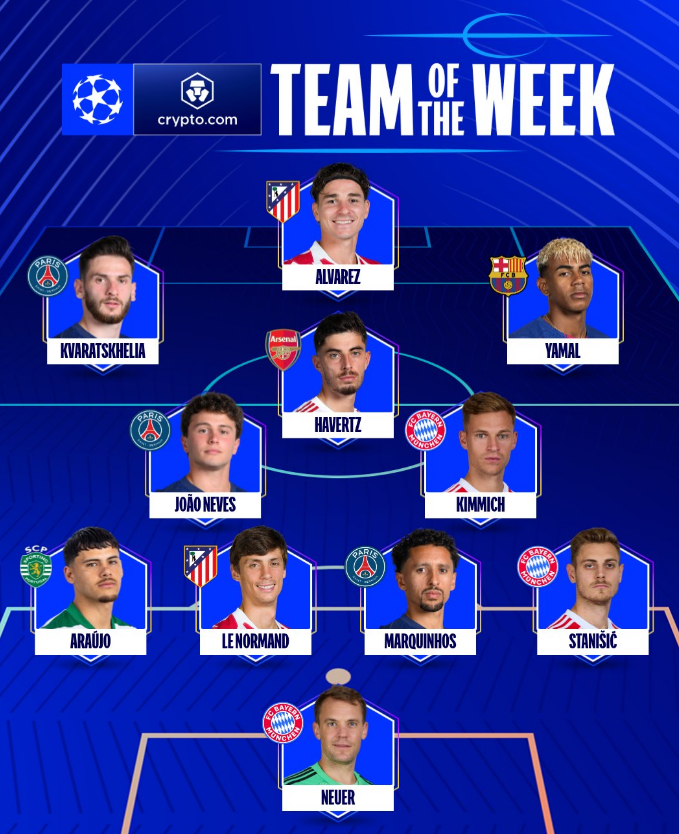 Formacioni më i mirë: Neuer, Stanisic, Marquinhos, Le Normand, Aeaujo, Kimmich, Joao Neves, Havertz, Kvaratsjhekua, Yamal, Alvarez.