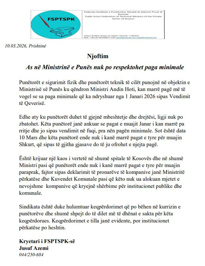 Kryetari i Sindikatës së Punëtorëve Teknikë dhe Sektorit Privat, Jusuf Azemi, ka bërë të ditur se punëtorët e sigurimit fizik dhe teknik që punojnë në objektet e Ministrisë së Punës vazhdojnë të përballen me pagë më të ulët se paga minimale, e cila është rritur nga 1 janari sipas vendimit të Qeverisë së Kosovës.
