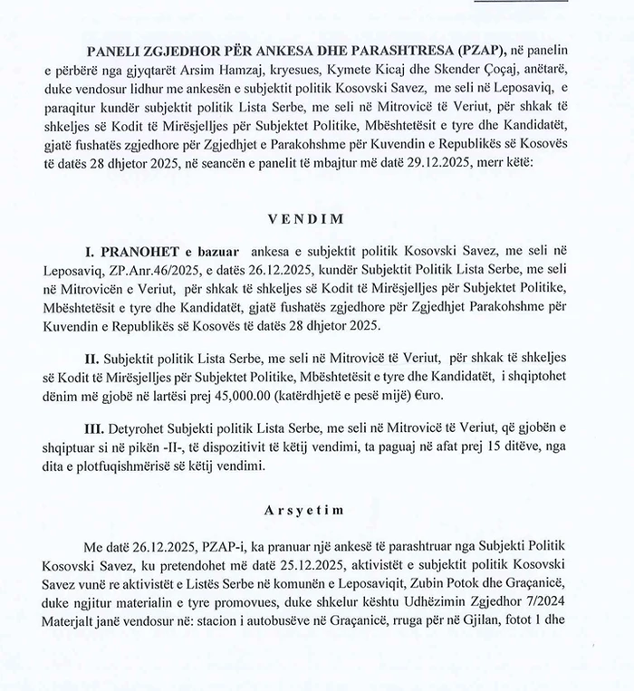 Paneli Zgjedhor për Ankesa dhe Parashtresa (PZAP) ka shqiptuar një gjobë prej 45,000 eurosh ndaj subjektit politik Lista Serbe, me seli në Mitrovicë të Veriut, për shkelje të Kodit të Mirësjelljes gjatë fushatës zgjedhore për zgjedhjet e parakohshme parlamentare të 28 dhjetorit 2025.