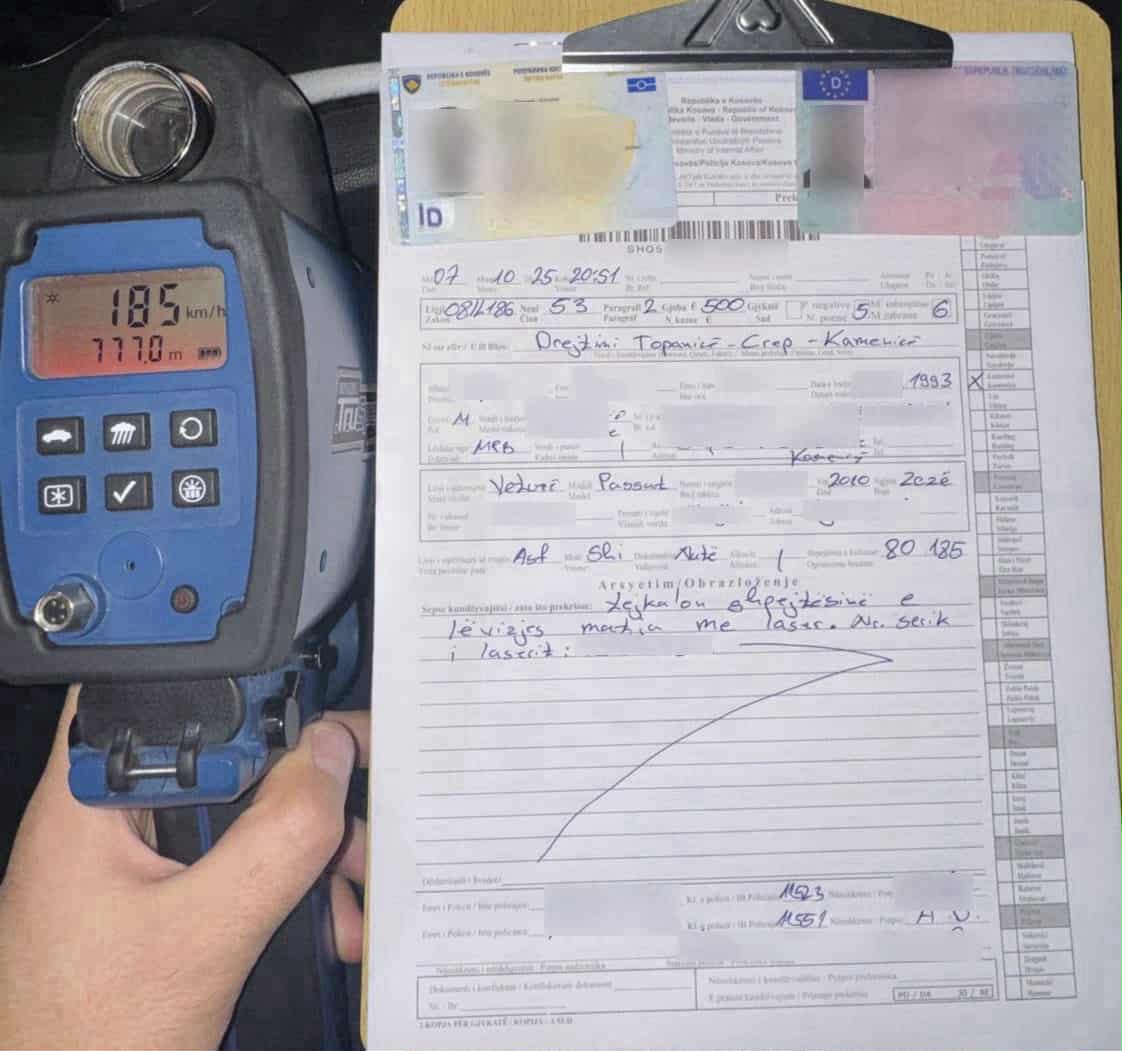 “Më datë 07.10.2025, rreth orës 21:00, në fshatin Topanicë, komuna e Kamenicës patrulla policore në pikë kontrolli me radar ka ndalur një automjet me targa të huaja, pasi që i njëjti në zonën ku me shenjë të trafikut është e lejuar lëvizja 80 km/h duke lëvizura me shpejtësi prej 185 km/h.Ngasësit të këtij automjeti i është shqiptuar gjoba konform ligjit për rregullat në trafikun rrugor në vlerë prej pesëqind (500) euro, pesë (5) pikë negative dhe shqiptuar masa mbrojtëse e ndalim të drejtimi të automjeteve në Republikën e Kosovës për gjashtë (6) muaj. I njëjti në atë moment përkundër urdhrave të ligjshëm të zyrtarëve policorë ka filluar që të bëjë vozitje të rrezikshme duke u larguar nga vendi ku ishte i ndalur dhe rrezikuar seriozisht pjesëmarrësit e tjerë në trafik”, ka deklaruar Hashani.