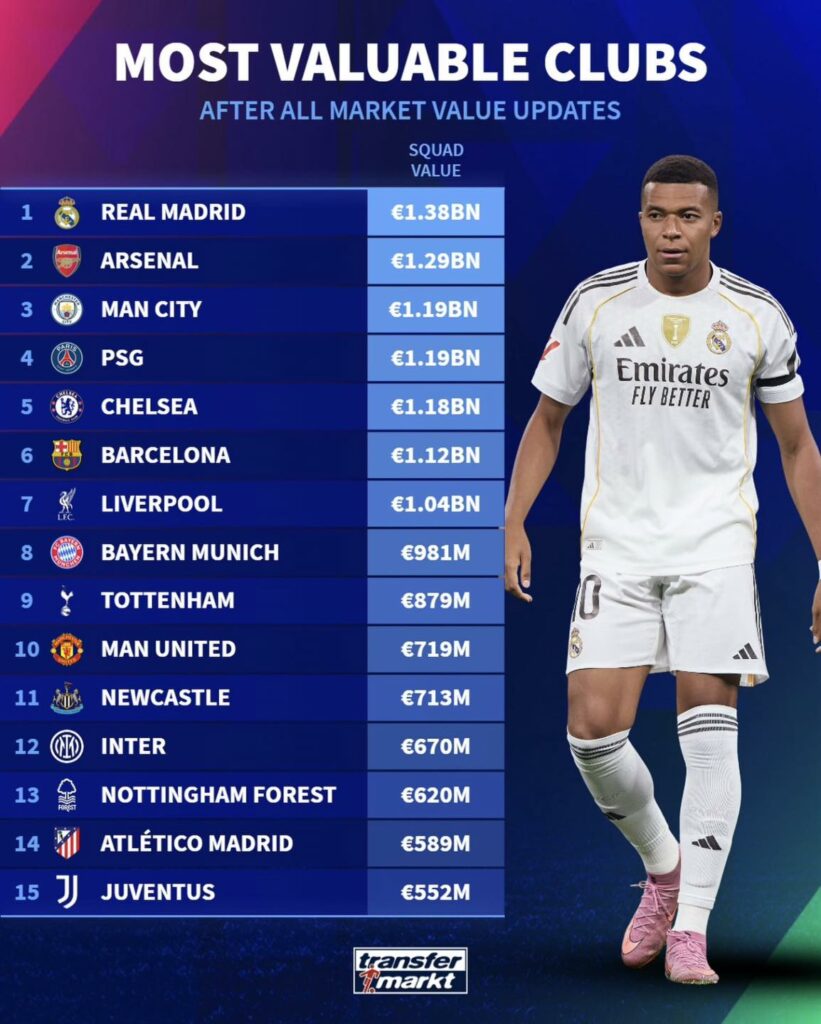 Skuadra me peshën më të madhe financiare vazhdon të jetë Real Madridi, i cili kryeson listën me një vlerë totale që kalon 1.38 miliardë euro. “Los Blancos” lënë pas Arsenalin, që me një përbërje të re dhe shumë lojtarë në rritje, arrin shifrën prej 1.29 miliardë eurosh.