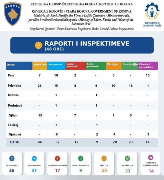 Inspektorati Qendror i Punës, në zbatim të vendimit të ministrit të MPFVLÇ-së dhe në përputhje me mandatin e tij ligjor, ka ndërmarrë aksion të jashtëzakonshëm inspektues në sektorët me rrezikshmëri të lartë, në të gjithë territorin e Republikës së Kosovës.