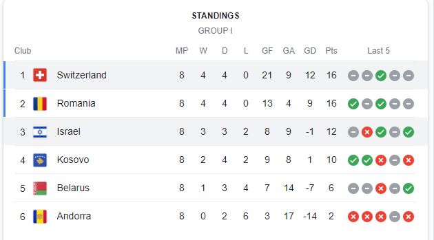Kur kanë mbetur edhe dy ndeshje për tu zhvilluara, gjithçka është ende e hapur në Grupin I, shkruan lajmi.net. Katër skuadra mund të kualifikohen në Kampionatin Evropian që do të mbahet në Gjermani. Kosova i bërë një nderë të madh Zvicrës e Rumanisë, duke e mposhtur Izraelin. Por, “Helvetikët” nuk e shfrytëzuan dhe u ndalën…