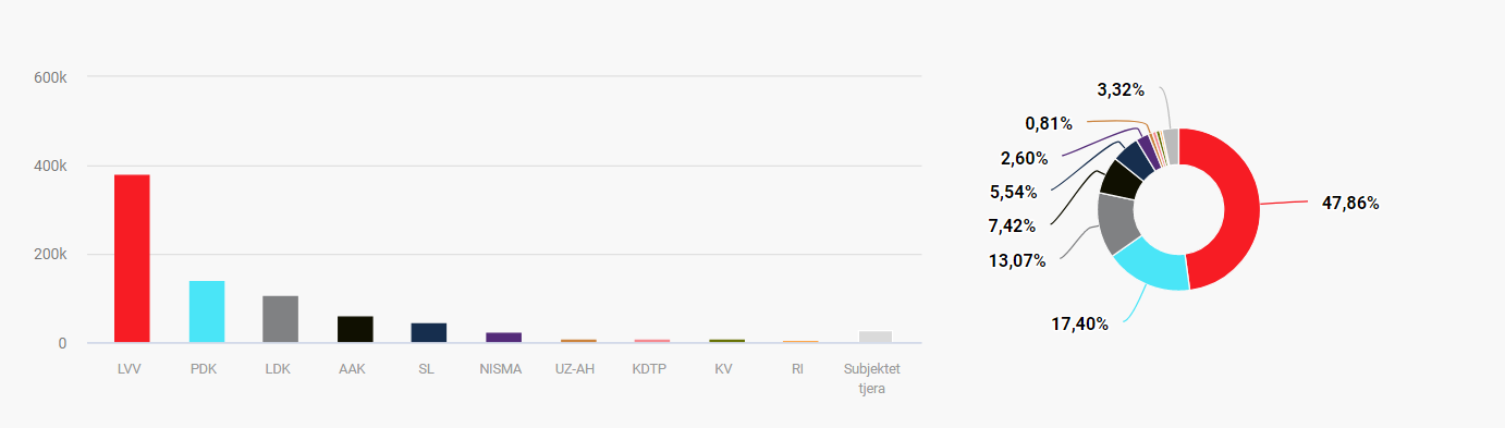 E dyta është Partia Demokratike e Kosovës me 17.40 për qind ose 137 mijë e 474 vota, Lidhja Demokratike e Kosovës e treta me 13.07 për qind ose 103 mijë e 291, Aleanca për Ardhmërinë e Kosovës e katërta 7.42 për qind ose 58 mijë e 619.