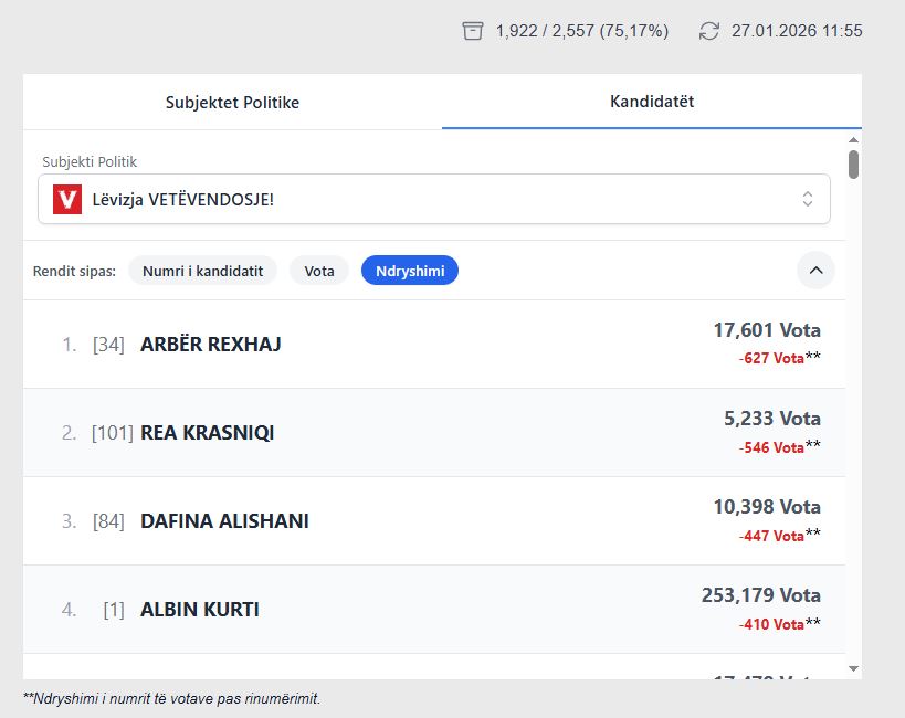 Janë rinumëruar mbi 75 për qind e votave të kandidatëve për deputetë. Deri më tani, shumë kandidatë kanë pësuar rënie të votave pas rinumërimit, transmeton lajmi.net. Njëri nga ta është Albin Kurti, kryetari i Lëvizjes Vetëvendosje. Sipas rezultateve të procesuara deri më tani, Albin Kurtit i janë hequr hiq më pak se 410 vota, duke…