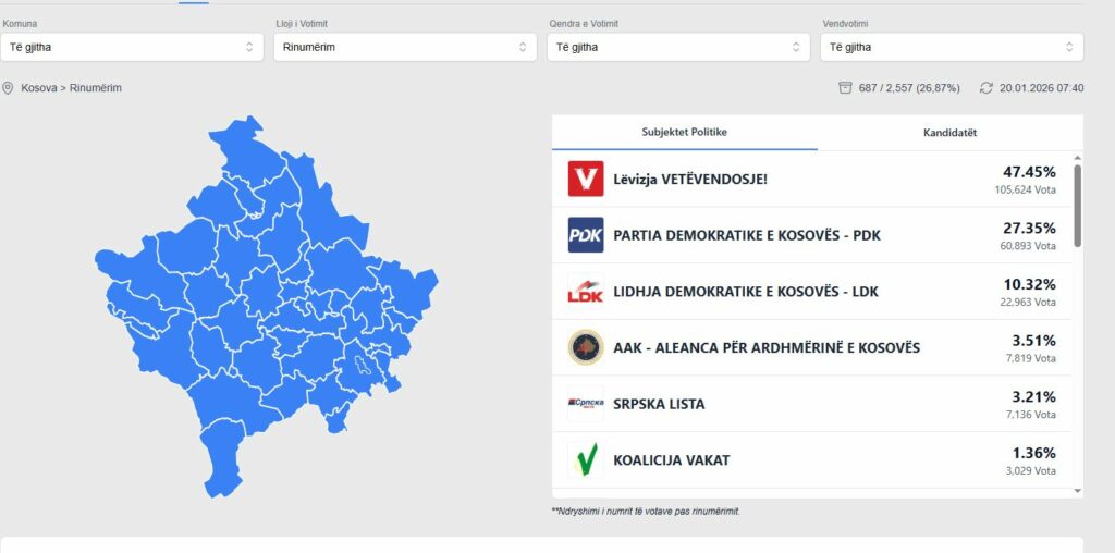 Në Qendrën e Numërimit dhe Rezultateve është duke vazhduar numërimi i fletëvotimeve sipas listës së vendvotimeve për të cilat KQZ ka marrë vendim që të rinumërohen. Sipas të dhënave nga ana e Komisionit Qendror të Zgjedhjeve deri më tash janë rinumëruar 687 vendvotime nga 2557 sa janë gjithsej. Nga përditësimi i fundit i KQZ-së, LVV…
